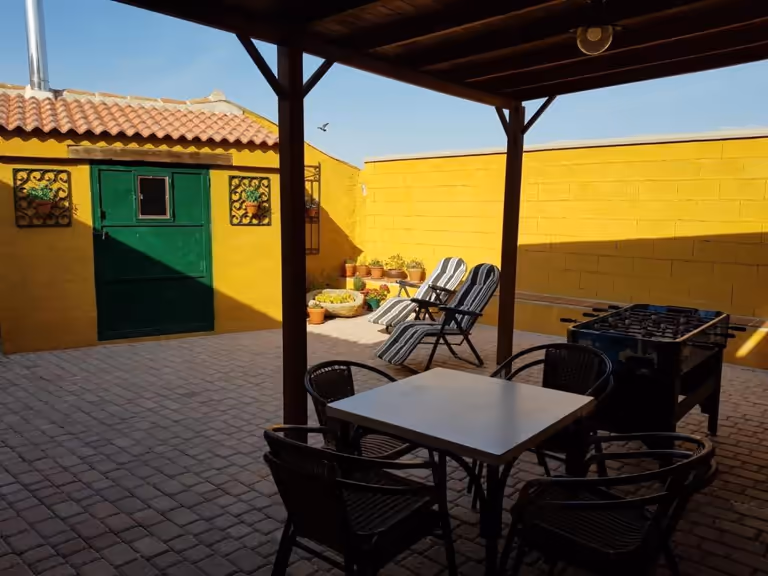 Mesa bajo pérgola en patio de alojamiento rural Ávila